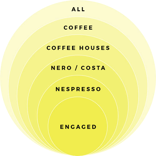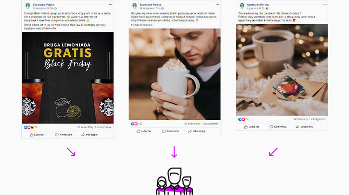 Na Facebooku oraz Instagramie zdefiniowaliśmy 6 niepokrywających się grup docelowych odpowiadających profilowi klienta SBX. Każdy kolejny poziom grupy oznaczał mniejszą świadomość kawiarni oraz zwyczaju korzystania z kawiarni ale wciąż pozostawał w związku zainteresowań kawy.